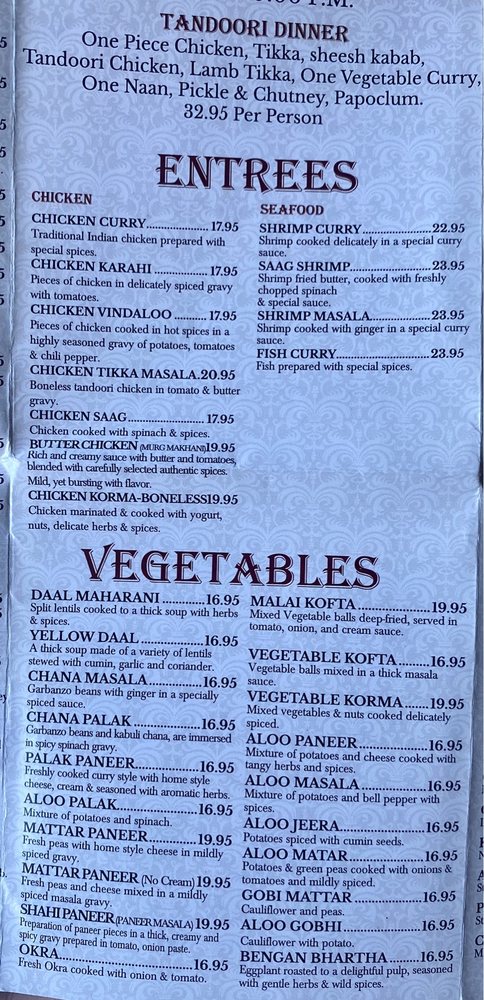 The menu boasts a diverse selection, from hearty Complete Dinners featuring chicken tikka and Tandoori chicken to a variety of flavorful seafood entrees like Shrimp Curry and Fish Curry. For vegetarians, options such as Daal Maharani and Chana Masala offer exquisite flavor profiles enriched with herbs and spices.